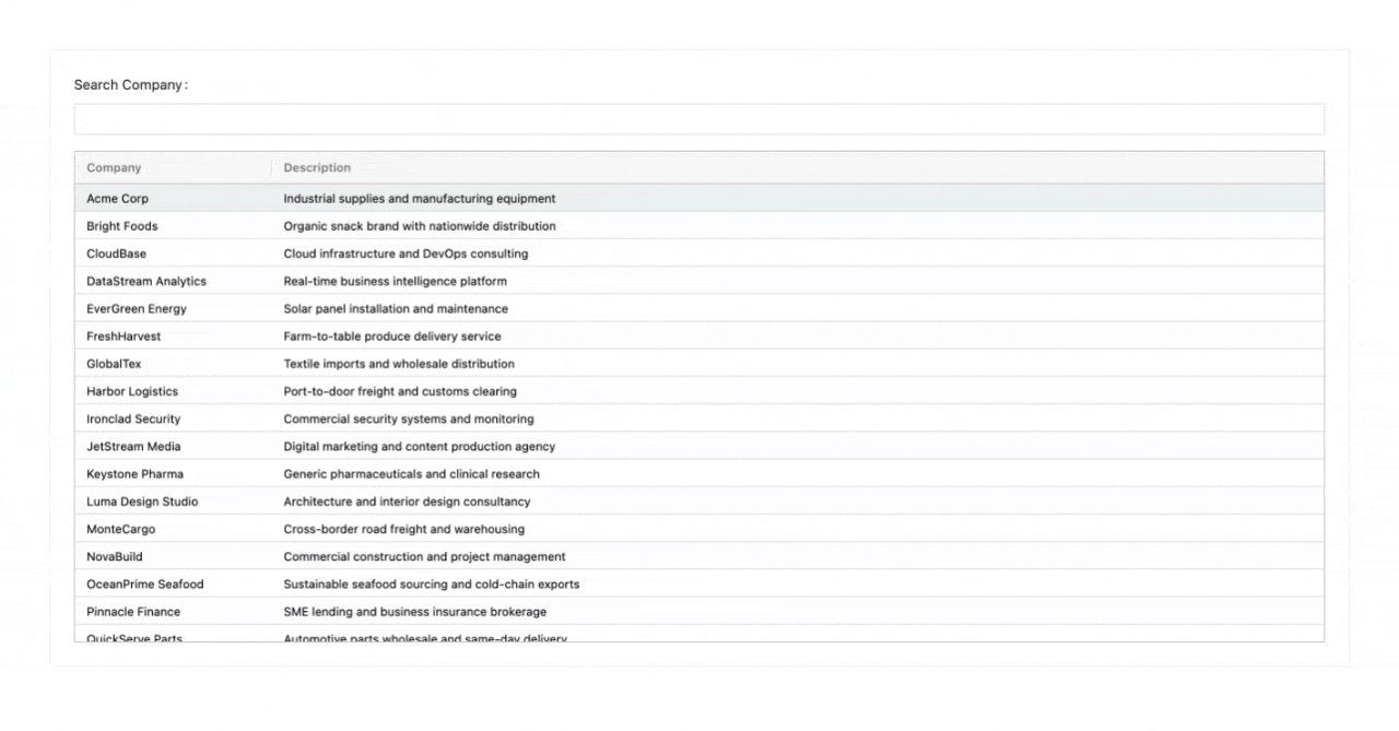 The first example wrote to a database, and this one reads from it. A searchable company directory that queries MongoDB in real time, with a sortable table. Usually that means a backend API, a frontend data table library, and a search implementation: