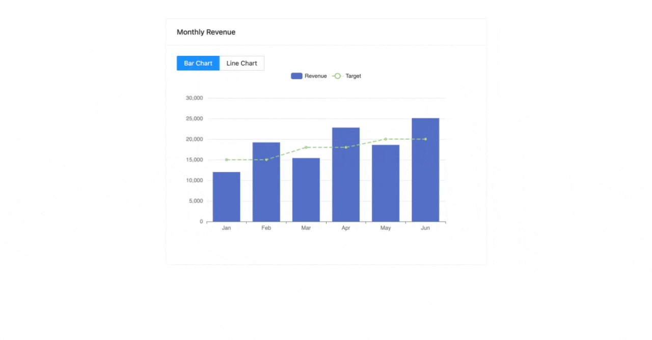 id: monthly-revenue type: Card properties: title: Monthly Revenue style: maxWidth: 700 margin: 40px auto events: onMount: - id: set_default type: SetState params: chart_type: bar blocks: - id: chart_type type: ButtonSelector properties: label: disabled: true options: - label: Bar Chart value: bar - label: Line Chart value: line - id: revenue_chart type: EChart properties: height: 400 option: tooltip: trigger: axis legend: data: [Revenue, Target] xAxis: type: category data: [Jan, Feb, Mar, Apr, May, Jun] yAxis: type: value series: - name: Revenue type: _state: chart_type data: [12000, 19200, 15400, 22800, 18600, 25100] - name: Target type: line data: [15000, 15000, 18000, 18000, 20000, 20000] lineStyle: type: dashed